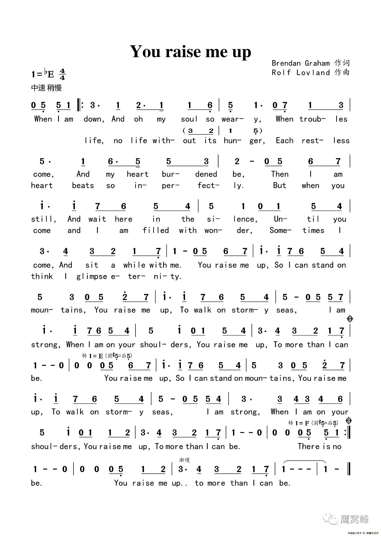 You Raise Me Up 简谱 中英文对照 歌谱 华语群星 赞美诗网
